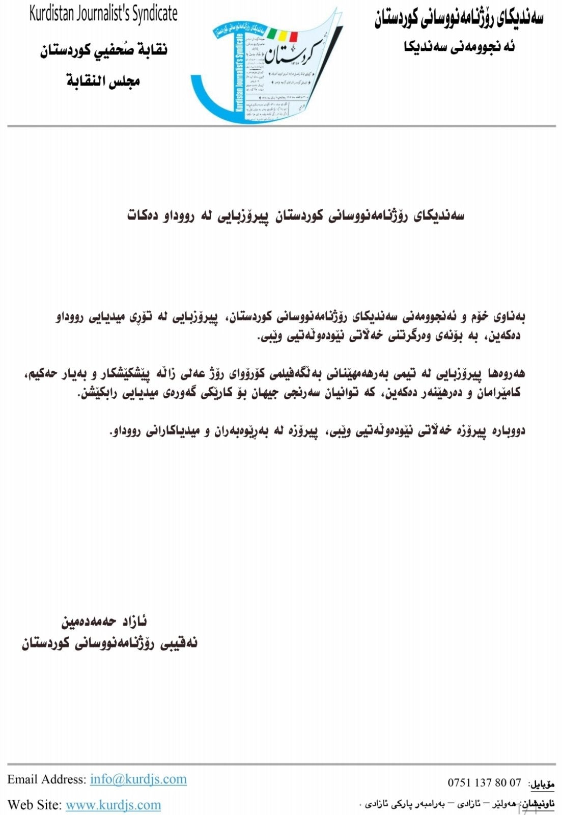 هەروەها لە بەشێکی دیکەی پەیامی نەقیبی سەندیکاکەدا هاتووە و پیرۆزبایی وەرگرتنی خەڵاتە لە بەڕێوەبەران و میدیاکارانی رووداو کردووە.