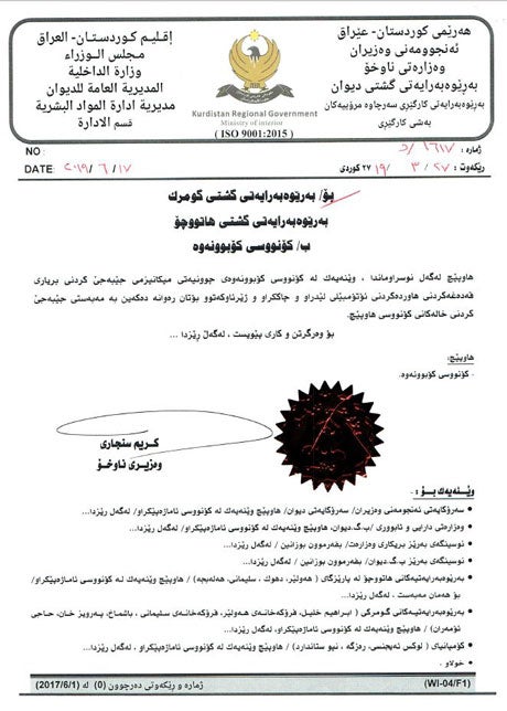 هەر بەپێی نوسراوی كۆنووسی كۆبوونەوەی لایەنە پەیوەندیدارەكانی پەیوەست بەو پرسە، بۆ جێبەجێکردنی ئەو بڕیارەی وەزارەتی ناوخۆ لە كاتی خۆیدا، لیژنەیەكی هونەری هاتووچۆی لەسەر ئاستی سێ پارێزگاكەی هەرێمی كوردستان پێكدەهێنرێت، بەمەرجێك لەو لیژنەیەدا نوێنەری هەردوو وەزارەتی دارایی و ناوخۆی تێدا بێت.