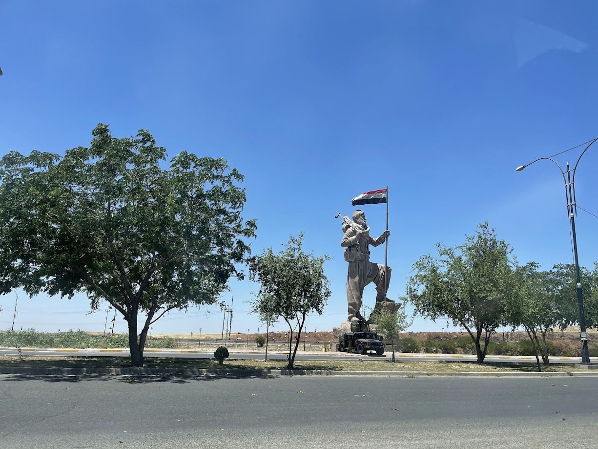دیمەنێکی پەیکەری پێشمەرگە لە دەروازەی کەرکووک کە ئاڵای عێراقی بەدەستەوەیە و ئۆتۆمبێلێکی سەربازیش لەبەردەمییەتی، وێنە: رووداو