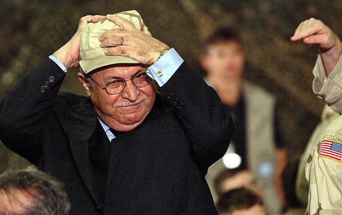 وێنەیەکی مام جەلال لە بەغدا پێش ئەوەی جۆرج دەبلیو بووش بگاتە کامپێکی سەربازانی ئەمریکی کڵاوێکی سەربازی لەسەر دەکات. وێنە: Anja Niedringhaus/AFP