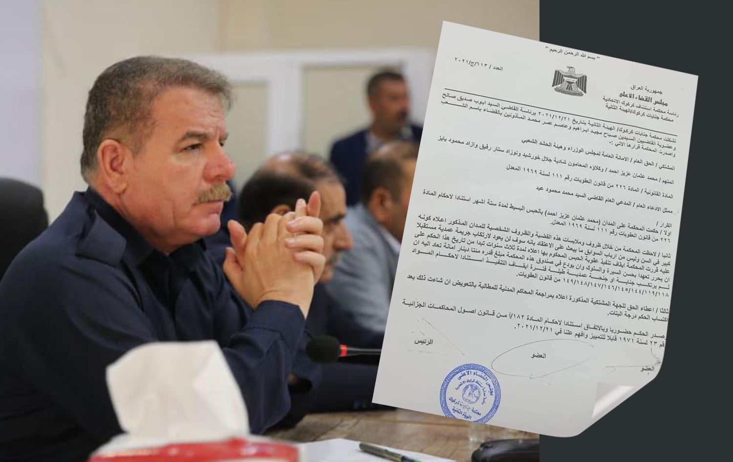 ئەو نووسراوەی بڵاوکراوەتەوە بۆ ساڵی 2021 دەگەڕێتەوە، دوای ئەوەی لە رۆژی 21-12-2021، تێیدا دادگەی تاوانەکانی کەرکووک لەسەر سکاڵای ئەمیندارێتی گشتی ئەنجوومەنی وەزیران و دەستەی حەشدی شەعبی و بەپێی مادەی 226ـی یاسای سزادانی ژمارە 111ـی ساڵی 1969ـی عێراقی بڕیاری شەش مانگ بەندکردنی بۆ محەممەد عوسمان عەزیز ناسراو بە حەمەسوور دووشیوانی دەرکردووە بەتۆمەتی سووکایەتیکردن.