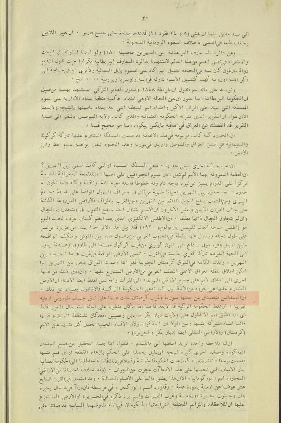 راپۆرتەکە باس لە ناوچەی نێوان دوو رووبار یان 'مێزۆپۆتامیا' دەکات و دەڵێت، "سنوورەکانی لە روژهەڵاتەوە لە دەشتەکانی سەر رووباری دیجلەوە دەستپێدەکات و لە باکووریشەوە دەگاتە ئەو چیا و بەرزاییانەی کە دەکەونە نێوان هەردوو رووبارەکە.