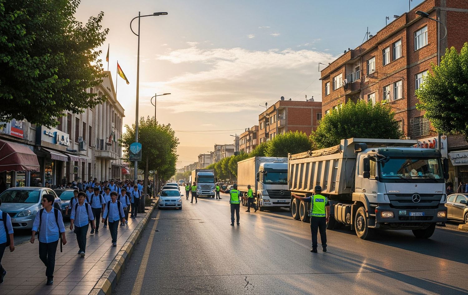 وێنەکە بە ژیریی دەستکرد دروستکراوە و گوزارشتە لەوەی رێگری لە بارهەڵگر دەکرێت بۆ ئەوەی قوتابییان بە سەلامەت بچنە قوتابخانە