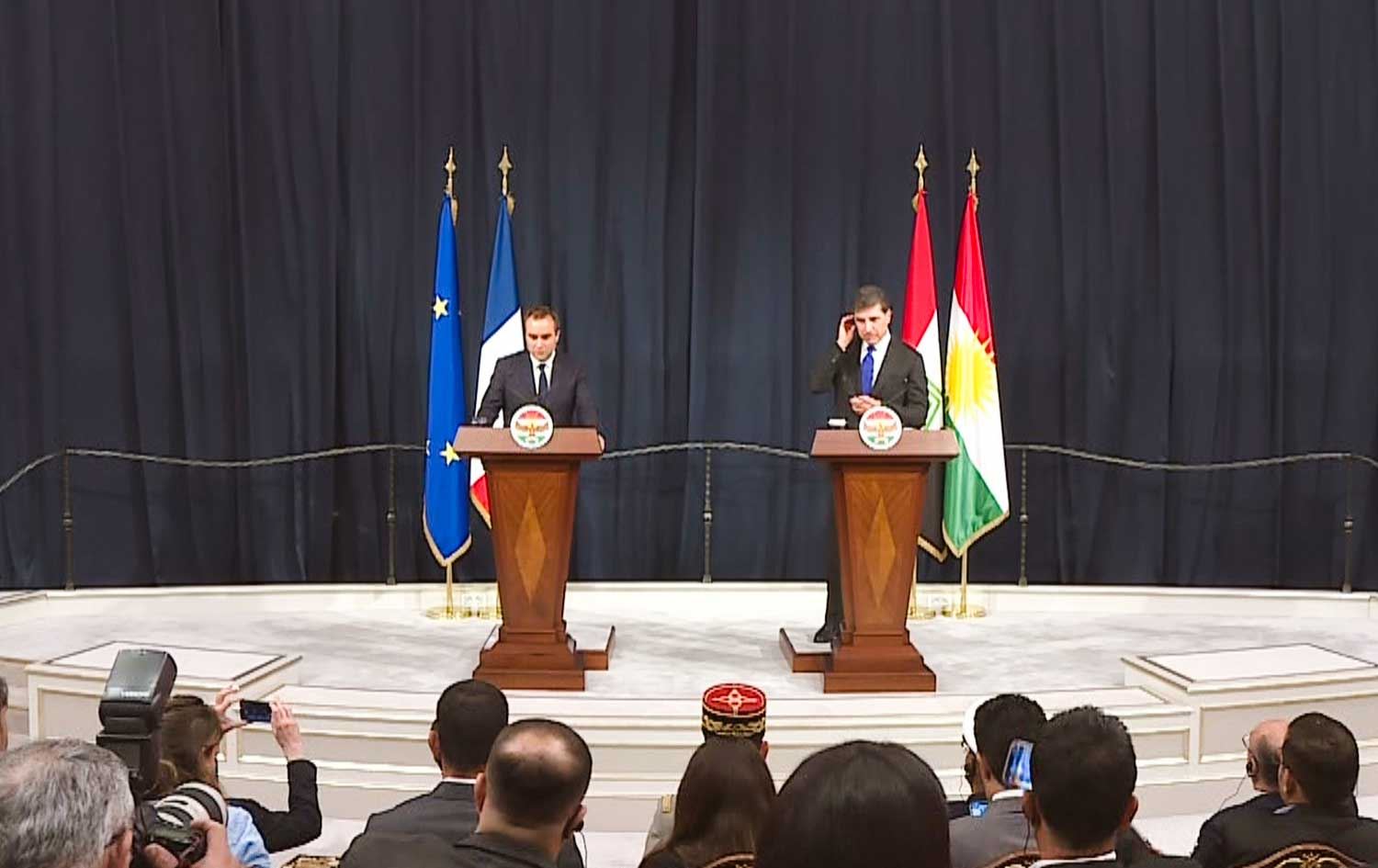 گوتەکانی سێباستیان لوکۆغنیو، وەزیری بەرگریی فەرەنسا لە کۆنگرە رۆژنامەڤانییەکەی لەگەڵ نێچیرڤان بارزانی، سەرۆکی هەرێمی کوردستان: