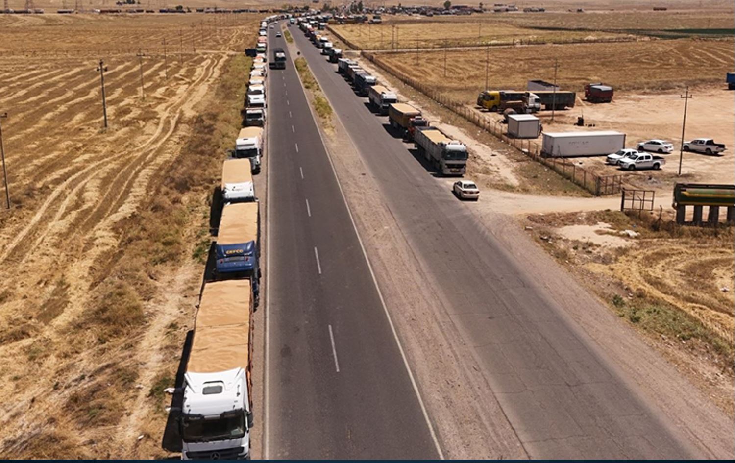 ژمارەیەک بارهەڵگر لە سایلۆی مەخموور نۆرەیان گرتووە بۆ رادەستکردنی گەنم. وێنە: بڵند تاهیر- رووداو