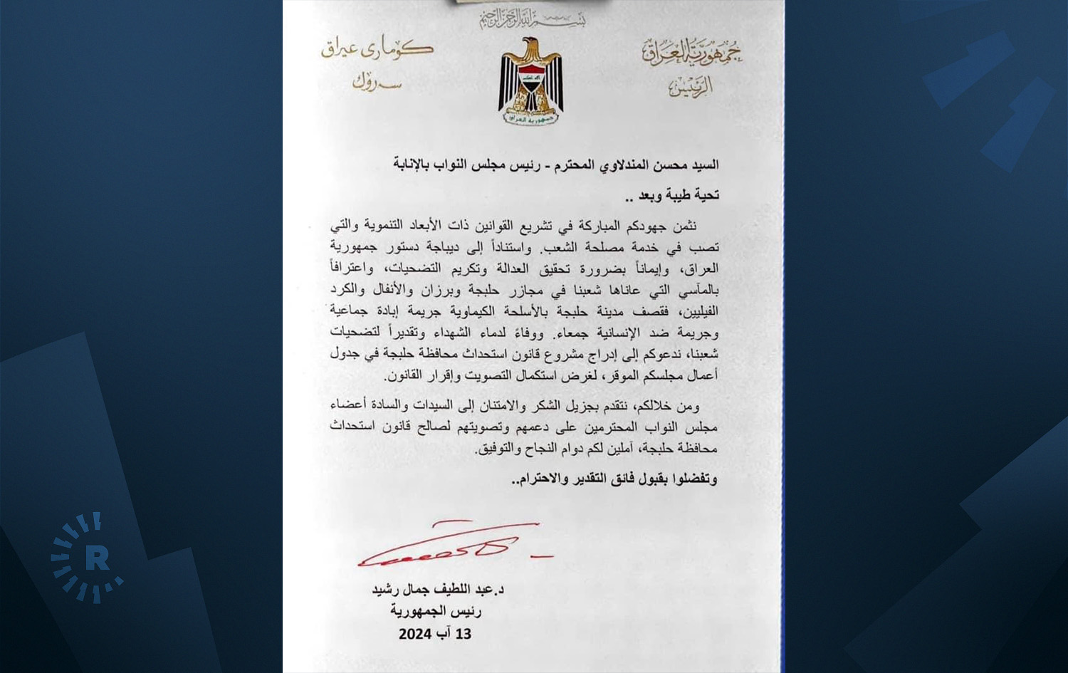 لەتیف رەشید، سەرۆککۆماری عێراق، لە نووسراوێکدا کە ئاڕاستەی موحسین مەندەلاوی، لەبری سەرۆکی پەرلەمانی کردووە، داوا دەکات پڕۆژەیاسای بەپارێزگاکردنی هەڵەبجە بخرێتە کارنامەی کارەوە و پەسندبکرێت.