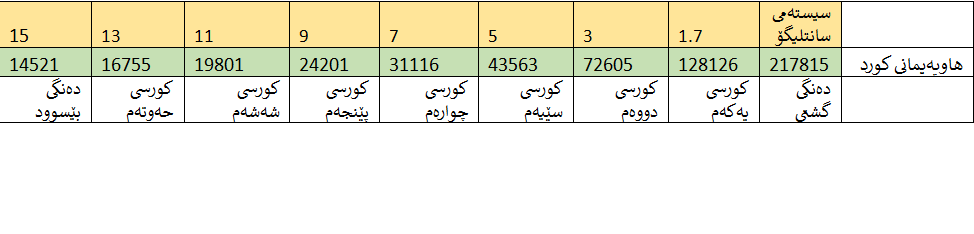 بەهای یەکەم کورسیی یەکێتی 81 هەزار و 984 دەنگە، بەڵام بەهای یەکەم کورسیی هاوپەیمانیی قیادە 34 هەزار و 958 دەنگە. هەروەها نەوەی نوێ 24 هەزار و 620 دەنگی بەدەستهێناوە، بەڵام بە گوێرەی سیستمەکە بۆ بەدەستهێنانی کورسیی یەکەم تەنیا 14 هەزار و 482 دەنگی بۆ رۆشتووە، بەڵام کورسیی یەکەمی نەوەی نوێ پێویستی بە نزیکەی 15 هەزار و 500 دەنگ هەبووە.