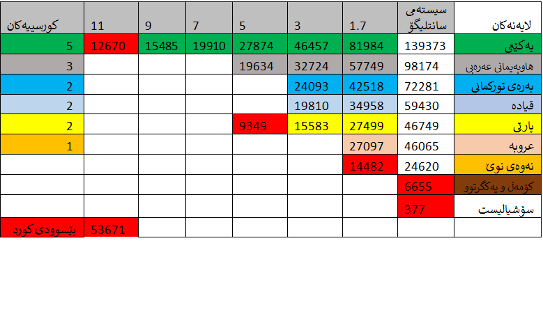 هەر بەهۆی سیستمی سانتلیگۆوە کورد لە کەرکووک 53 هەزار و 671 دەنگی بێسوود بووە. یەکێتی 12 هەزار و 670 دەنگی بێسوودی هەبووە، پارتی 9 هەزار و 349 دەنگ، نەوەی نوێ 24 هەزار و 620 دەنگ، کۆمەڵ و یەکگرتوو 6 هەزار و 655 دەنگ، سۆشیالیست 377 دەنگ.