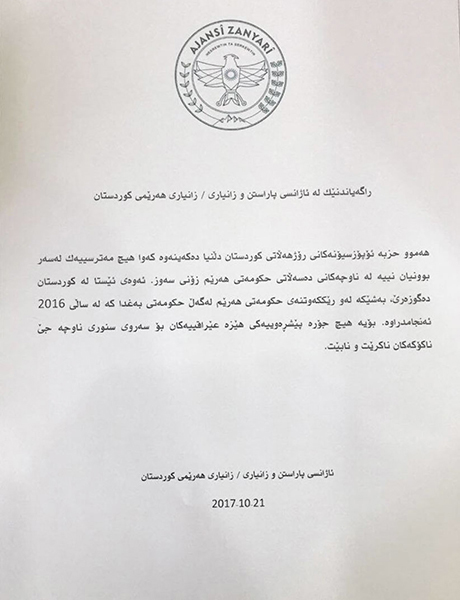 ئاژانسی پاراستن و زانیاری/ زانیاریی هەرێمی کوردستان رایدەگەیێنێت: ئەوەی ئێستا لە كوردستان دەگوزەرێ بەشێكە لەو رێككەوتنەی حكومەتی هەرێمی کوردستان ساڵی 2016 لەگەڵ بەغدا کردوویەتی. جەختیش دەکاتەوە کە هێزە عیراقییەكان هیچ جۆرە پێشڕەوییەك لە ناوچە کوردستانییەکانی دەروەی ئیدارەی هەرێمی کوردستانەوە زیاتر ناكەن و نابێت.