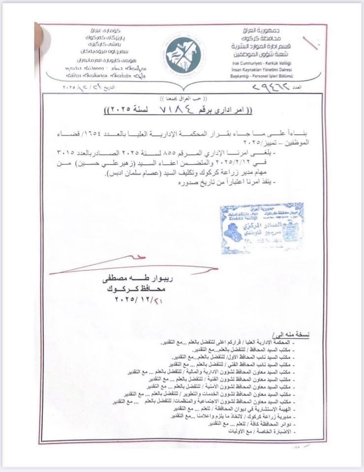 بەگوێرەی نووسراوێکی فەرمی کە واژۆی پارێزگاری کەرکووکی لەسەرە و رۆژی یەکشەممە، 21-12-2025، دەرچووە، تێیدا هاتووە، پاڵپشت بە بڕیاری دادگەی باڵای کارگێڕی، فەرمانی کارگێڕیی پێشوو کە لە 12-02-2025 دەرچووە، هەڵوەشێندرایەوە.