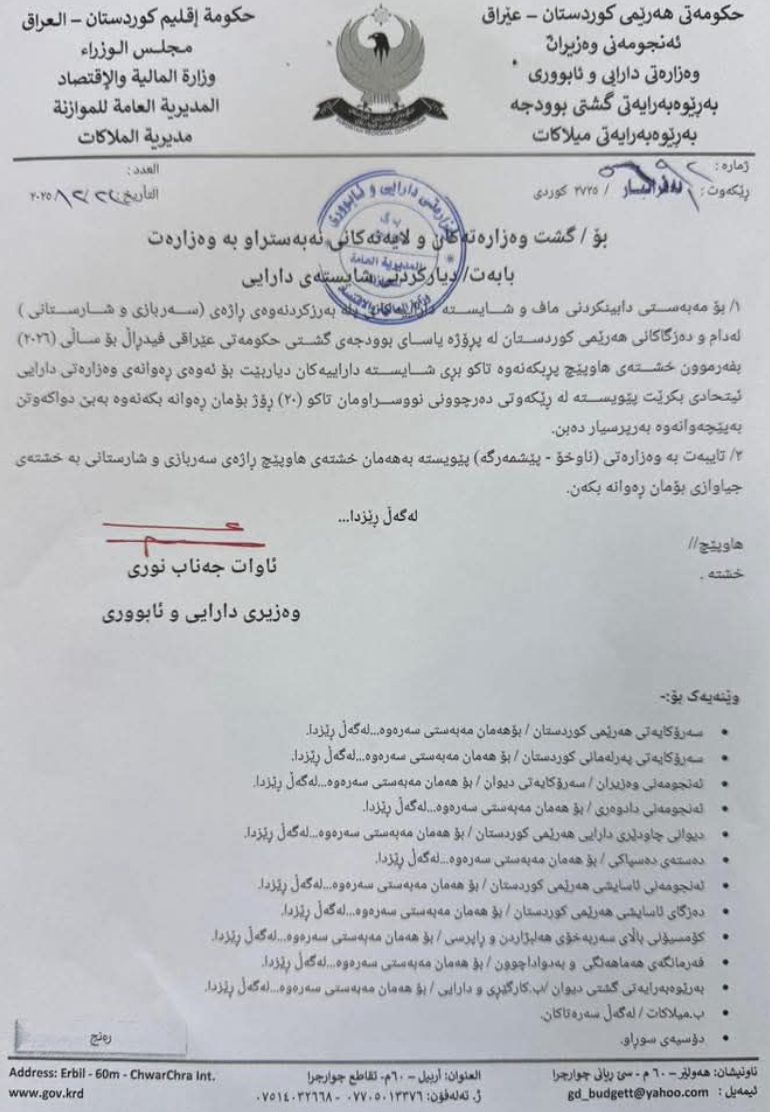 بەپێی نووسراوێکی فەرمی کە واژۆی ئاوات شێخ جەناب، وەزیری دارایی و ئابووریی هەرێمی کوردستانی لەسەرە و ئەمڕۆ دووشەممە، 22-12-2025 دەرچووە، ئاراستەی سەرجەم وەزارەت و لایەنە نەبەستراوەکان بە وەزارەت کراوە و تێیدا هاتووە، "بەمەبەستی دابینکردنی ماف و شایستە داراییەکانی پلەبەرزکردنەوەی راژەی سەربازی و شارستانی لە دامودەزگاکانی هەرێمی کوردستان، لە چوارچێوەی پڕۆژەیاسای بودجەی گشتیی فیدراڵی بۆ ساڵی 2026، خشتەی پلەبەرزکردنەوە پڕبکرێتەوە."