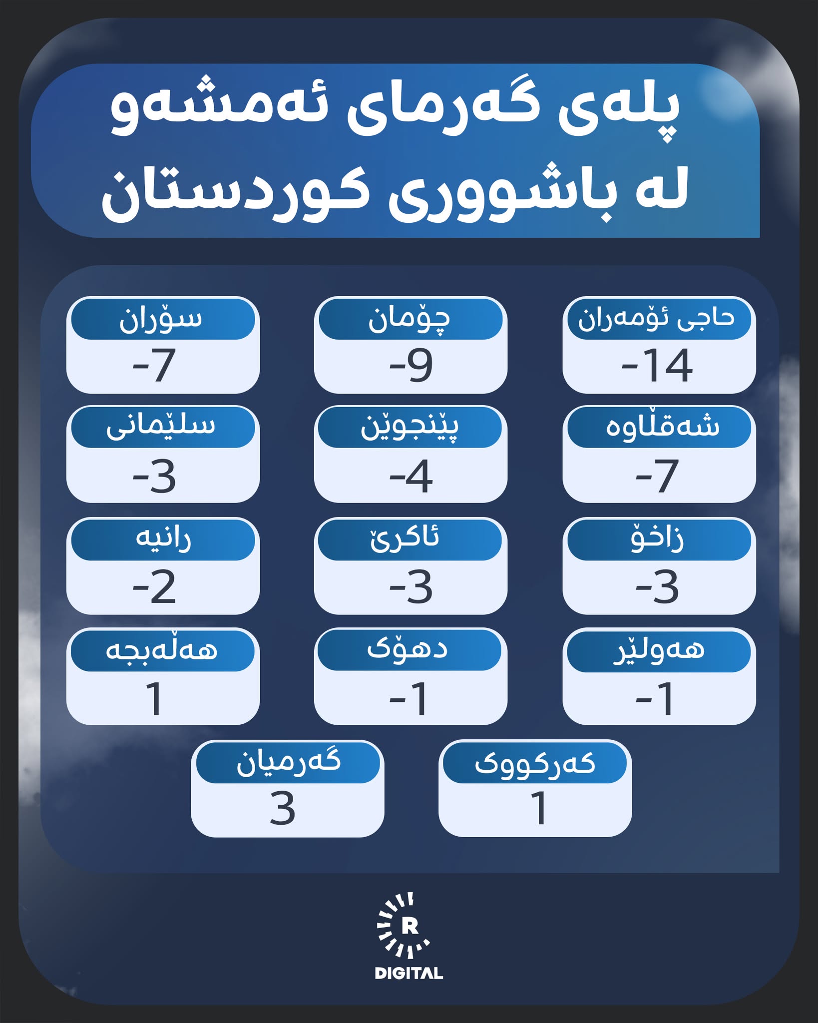 لە چوارشەممەوە شەپۆلێکی باران و بەفربارین هەرێمی کوردستانی گرتووەتەوە. پلەکانی گەرما لە هەندێک ناوچەی هەرێمی کوردستان بۆ ژێر سفر دابەزیون.