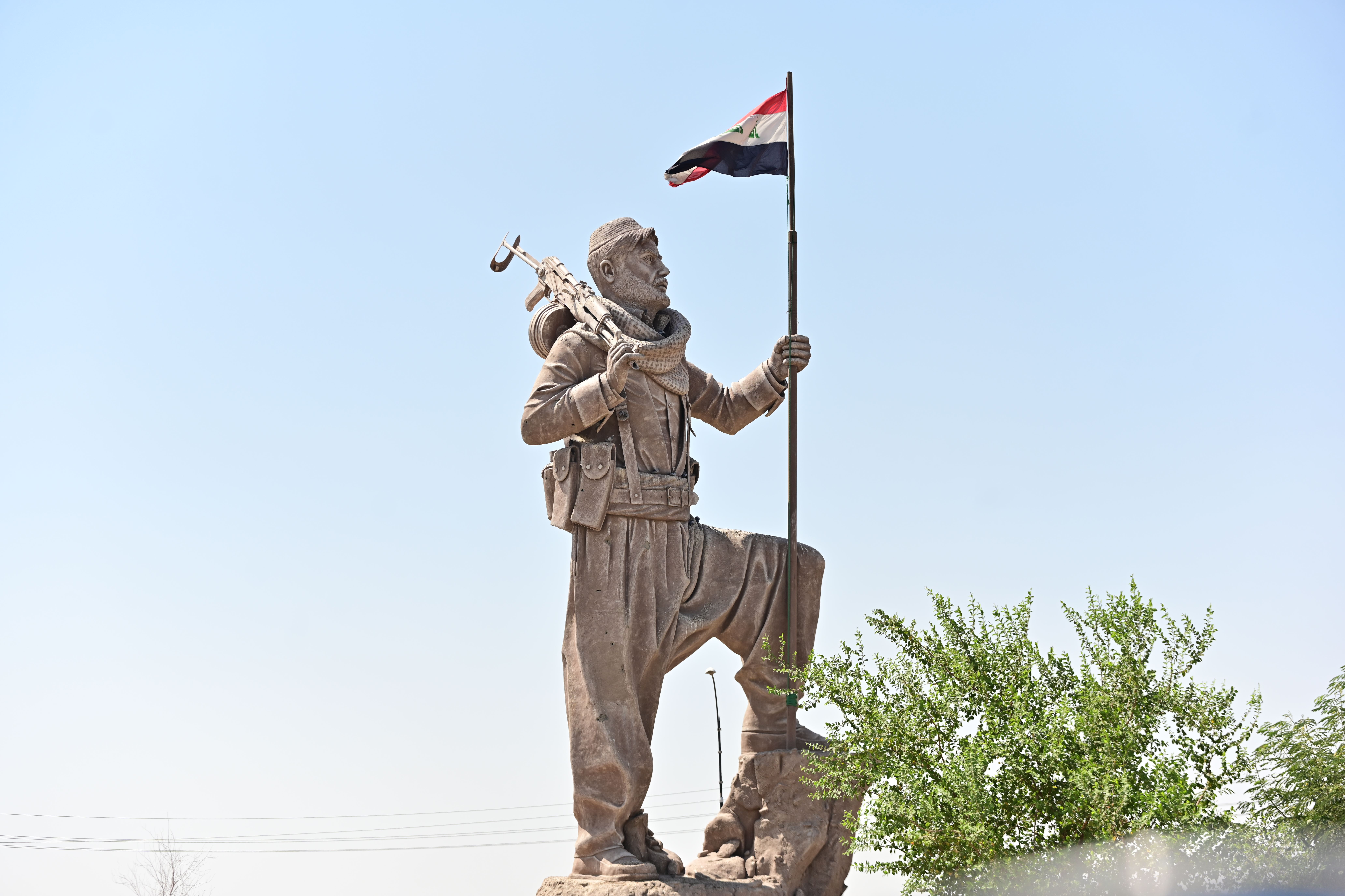 پەیکەری پێشمەرگە لە دەروازەی شاری کەرکووک کە لەدوای 16ـی ئۆکتۆبەرەوە ئاڵای عێراقی بەدەستەوەیە، وێنە: بڵند تاهیر - رووداو