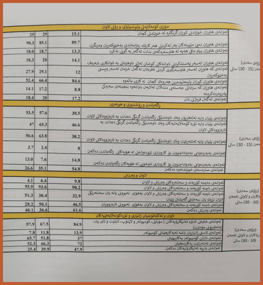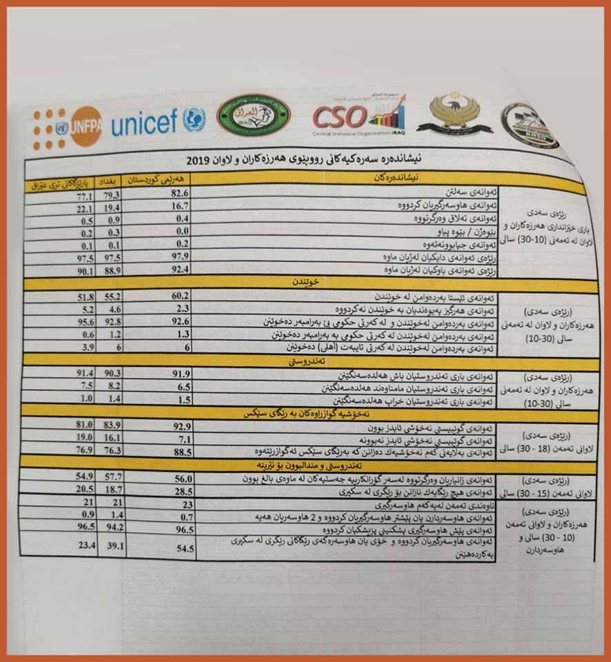 رووپێویی هەرزەکاران و لاوان لە هەرێمی کوردستان لە ساڵی 2019 لەلایەن وەزارەتی پلاندانان، دەستەی ئاماری هەرێمی کوردستان، وەزارەتی رۆشنبیری و لاوان و بە هاوکاریی رێکخراوەکانی UNFPA و UNICEF لە سێ پارێزگای هەرێمی کوردستان لەسەر کەسانی تەمەن 10 بۆ 30 ساڵ کراوە. بەپێی رووپێوییەکە، 92.6%ـی بەشداربووان بێبەرامبەر لە کەرتی حکومی دەخوێنن، بەڵام 39.9%یان گرنگی بە خوێندن دەدەن. هاوکات 23%ـی گەنجان و هەرزەکاران هیچ رێگەیەک نازانن بۆ رێگری لە سکپڕی.