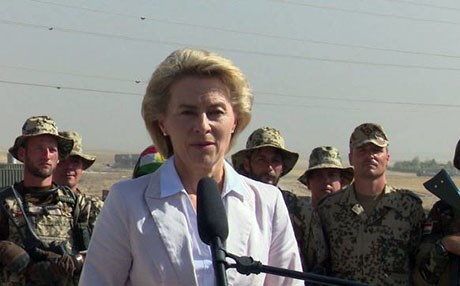 خانمە وەزیرەکەی ئەڵمانیا لەگەڵ فەرماندە سەربازییەکانی پێشمەرگە و هێزەکانی ئەڵمانیا رۆژی هەینی 23-9-2016 سەیری نمایشێکی سەربازی هێزی پێشمەرگەیان کرد بۆ شەڕی کۆڵان بە کۆڵان، تاوەکوو ئێستا لەسەر دەستی 1100 فەرماندە و سەربازی ئەکادیمی ئەڵمانی، لەم کەمپە مەشق بە 10 هەزار پێشمەرگە کراوە.
