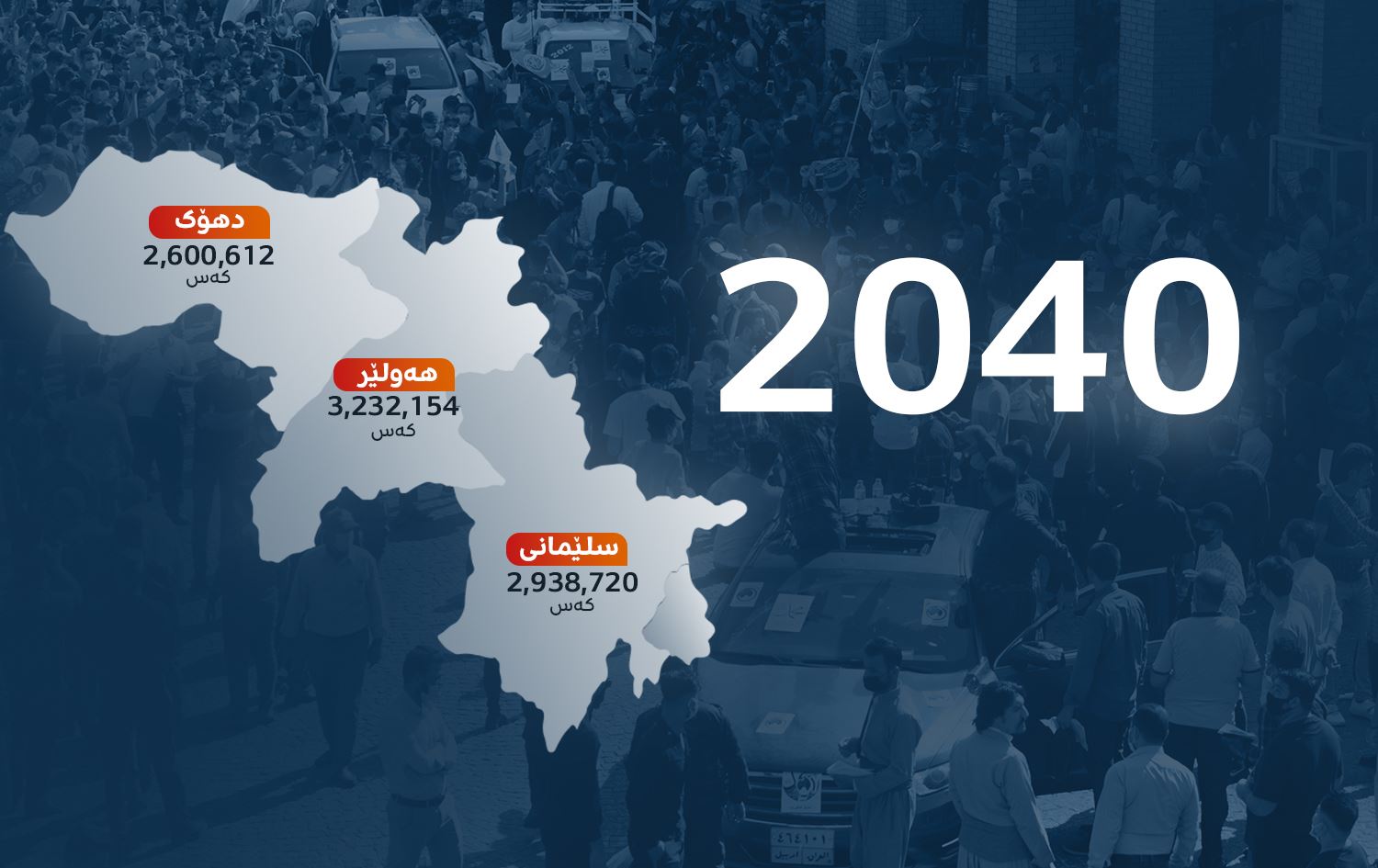 نەخشەی هەرێمی کوردستان و ژمارەی دانیشتووانەکانیان بەپێی پێشبینییەکانی وەزارەتی پلاندانانی هەرێمی کوردستان بۆ ساڵی 2040