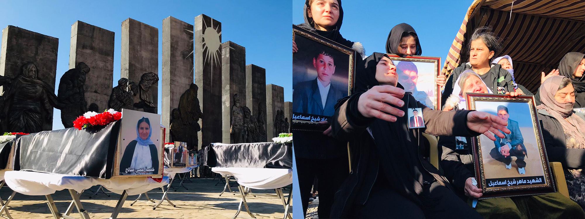 کەسوکاری قوربانییان و خەڵکی شنگال و کەسایەتییە ئایینییەکان لە مۆنیۆمێنتی جینۆسایدی ئێزدیان لە شنگال لە رێوڕەسمەکە ئامادەن و رووفاتەکان رادەستی کەسوکاریان دەکرێنەوە.