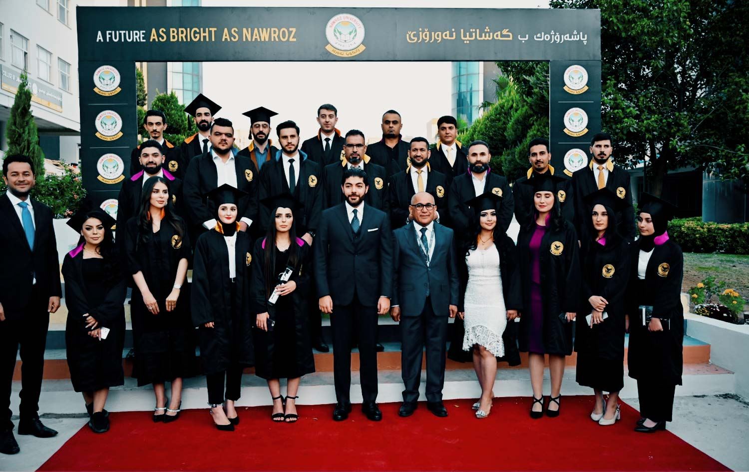 دوای ئەوەی دەرچووانی زانکۆی نەورۆز چوونە سەر ستەیج، ستافی مامۆستای زانکۆکەش لەسەر ستەیج وەستان؛ ئەو زانکۆیە ئێستا زیاتر لە 300 مامۆستا و وانەبیژی هەیە. لەگەڵ خوێندنەوەی سروودی نیشتمانیی عێراق و سروودی نیشتمانیی کوردستان، ئامادەبووان خولەکێک وەستانی رێزیان پیشاندا.