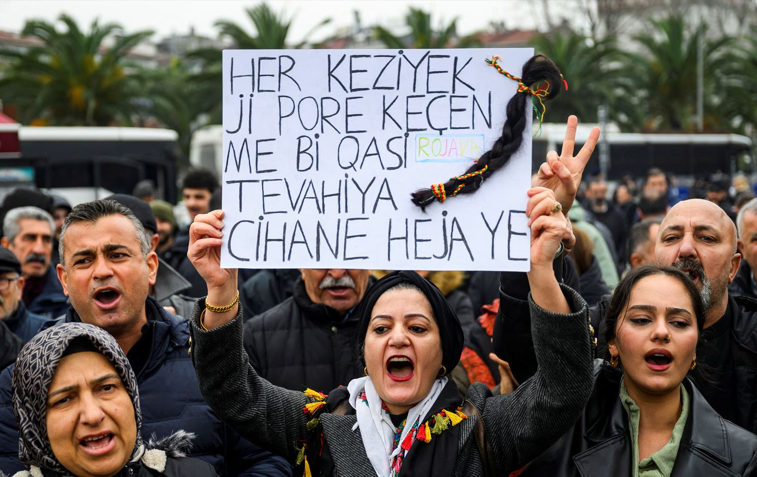 خۆپێشاندەران پانکارتیان بەدەستەوە بوو کە لەسەریان نووسرابوو، "رۆژئاوا ویژدانە، ئازادییە، بەرخۆدانە، تەسلیم نابێت"، "خاوەنداریکردن لە رۆژئاوا خاوەنداریکردنە لە مرۆڤایەتی" و "هەر تالێک لە قژمان بەرخۆدانمان بەهێز دەکات".