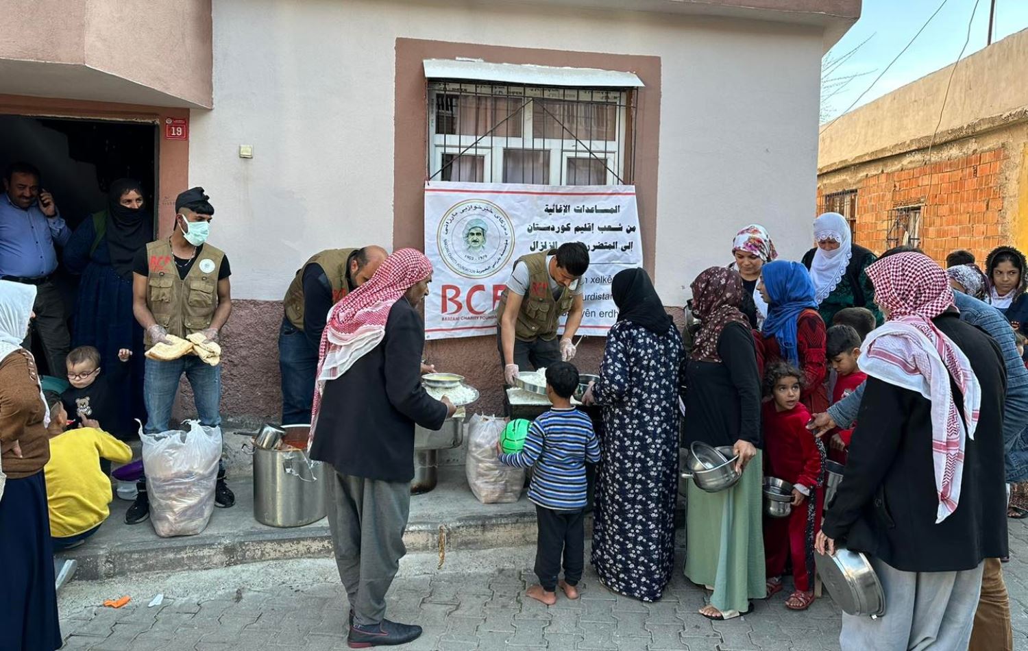 تیمی فریاگوزاریی دەزگای خێرخوازیی بارزانی لە ئامەد لەکاتی دابەشکردنی یەکەمین ئێوارە خوانی مانگی رەمەزان بەسەر خەڵکی زیانبەرکەوتووی بوومەلەرزە، وێنە: پەیجی barzanifoundation لە فەیسبووک