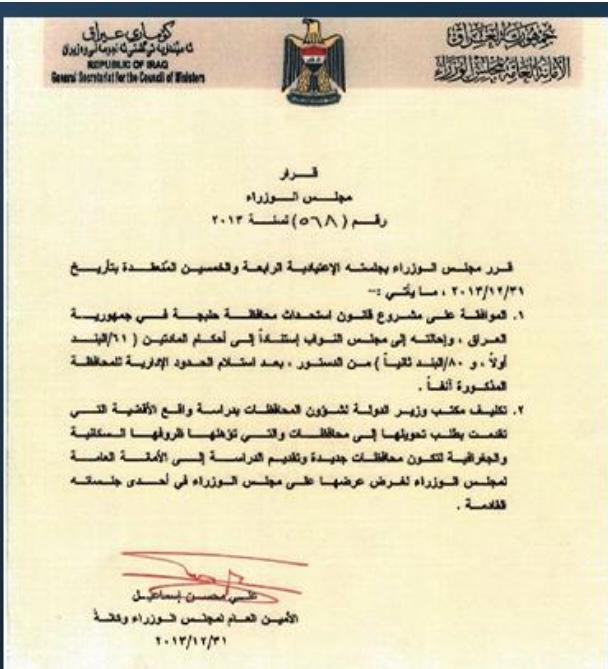 دەقی نووسراوەکەی ئەمیندارێتیی ئەنجوومەنی وەزیرانی عێراق: