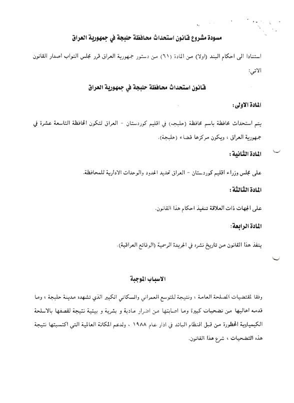 هاوپێچ: دەقی رەشنووسی پڕۆژەیاسای هێنانەکایەی پارێزگای هەڵەبجە لە کۆماری عێراق