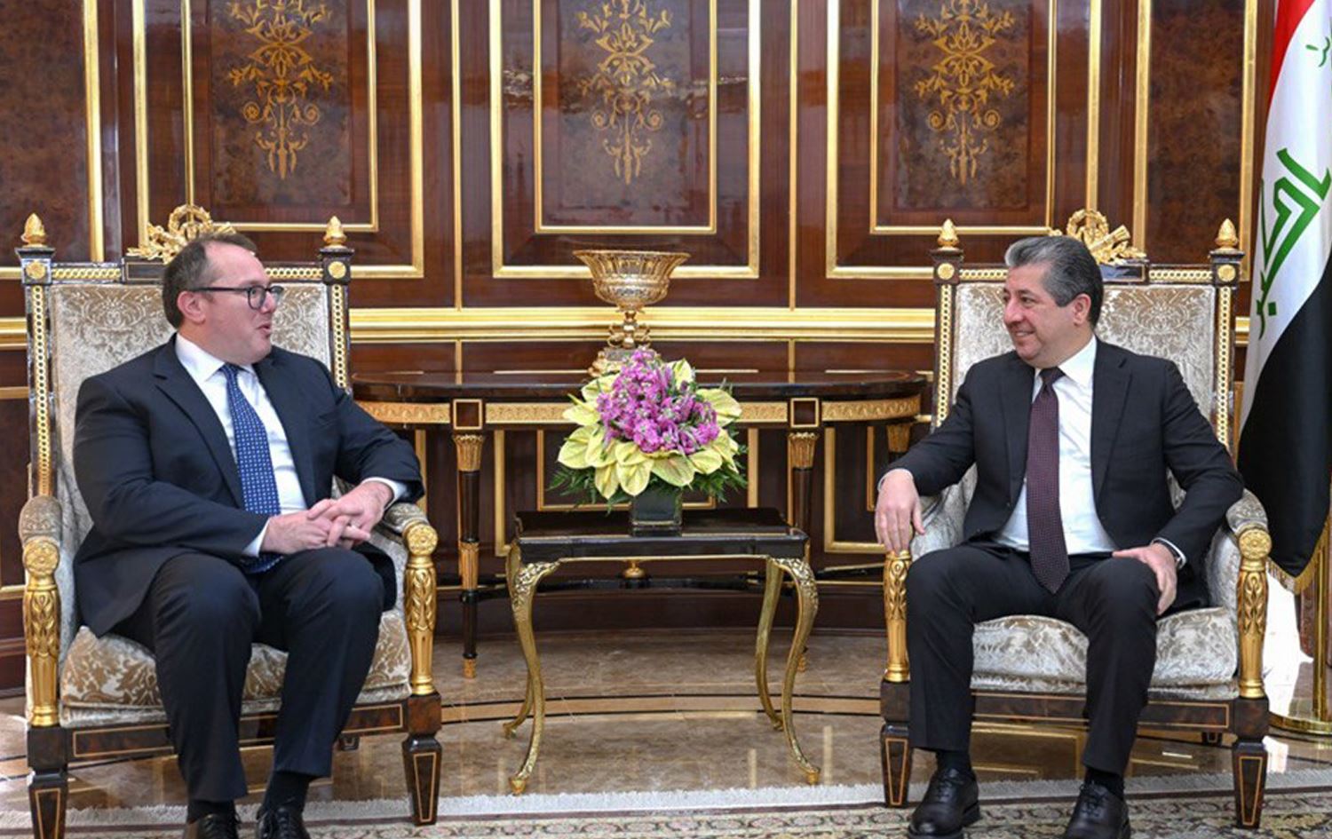 مەسرور بارزانی، سەرۆکوەزیرانی هەرێمی کوردستان و جۆشوا هاریس، هەڵسوڕێنەری کاروباری باڵیۆزخانەی ئەمریکا لە بەغدا.