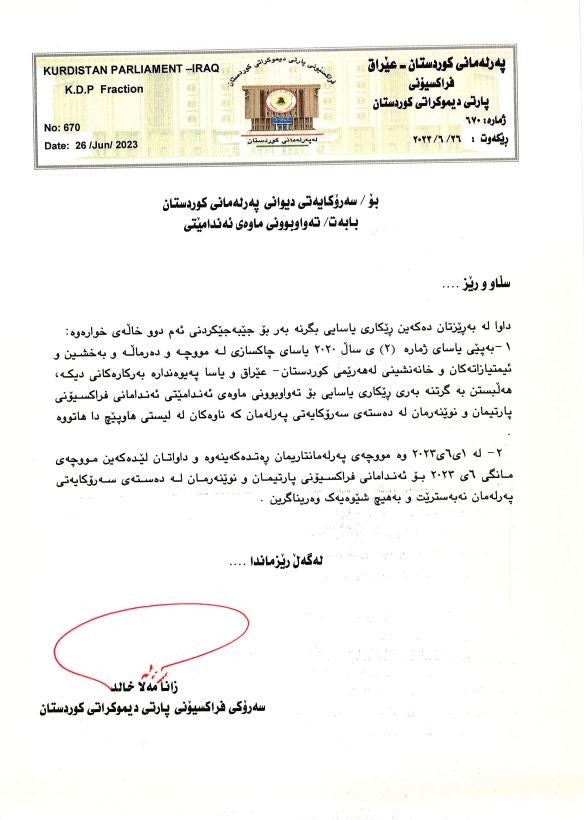 زانا مەلا خالید، سەرۆکی فراکسیۆنی پارتی دیموکراتی کوردستان لە پەرلەمانی کوردستان لە کۆنفراسێکی رۆژنامەڤانیدا رایگەیاند، "ئەرکی پەرلەمانیمان لە خولی پێنجەمی پەرلەمانی کوردستان کۆتایی پێهێنا."