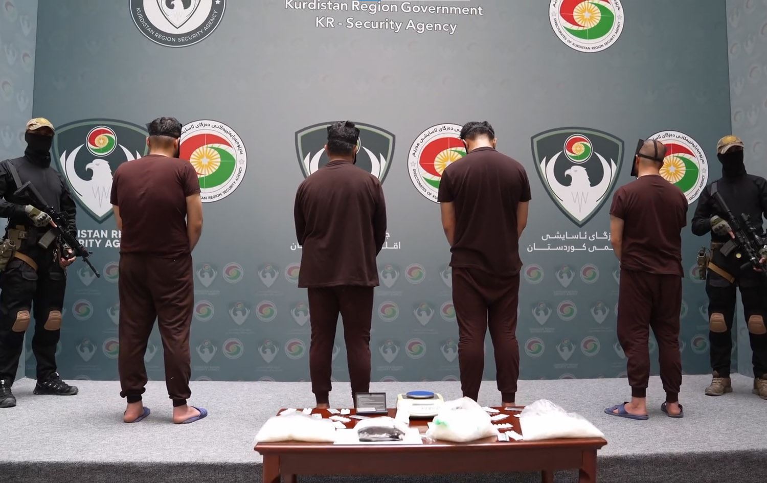 چەند کەسێک کە بە تۆمەتی بازرگانی بە مادەی هۆشبەر لە مانگەکانی رابردوو دەستگیرکراون. وێنە: بەڕێوەبەرایەتیی گشتیی ئاسایش - سلێمانی