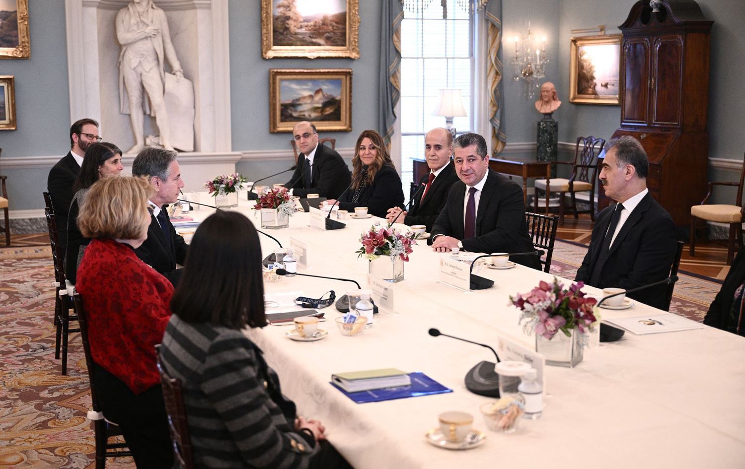 وێنەیەک لە کۆبوونەوەی نێوان شاندی حکومەتی هەرێمی کوردستان بە سەرۆکایەتی مەسرور بارزانی و شاندی وەزارەتی دەرەوەی ئەمریکا بە سەرۆکایەتی ئەنتۆنی بلینکن.