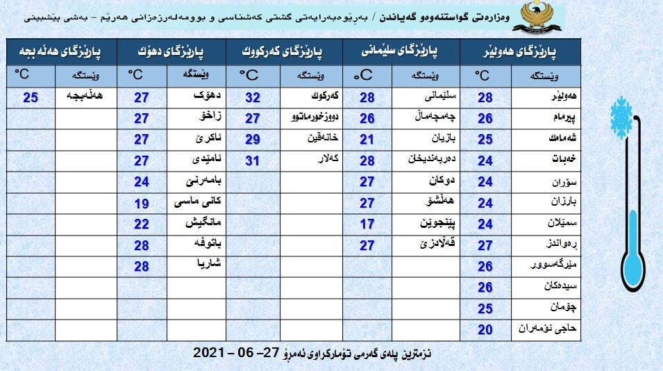 نزمترین پلەی گەرمای تۆمارکراوی ئەمڕۆ یەکشەممە لە هەولێر 28 پلەیە، لە سلێمانی 28 پلە، لە کەرکووک، 32 پلە، لە دهۆک 27 پلە و لە هەڵەبجەش 25 پلەیە.