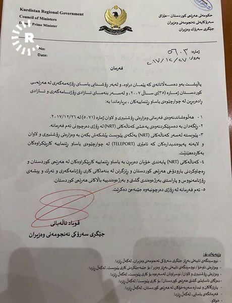 سەرەتا فەرمانی راگرتنی پەخشی تەلەڤزیۆنەکانی NRT لەلایەن وەزارەتی رۆشنبیری و لاوانی حکومەتی هەرێمی کوردستان بۆ هەفتەیەک بوو، بەڵام دوێنێ سێشەممە دوای تەواوبوونی ماوەی فەرمانەکە بۆ هەفتەیەکی دیکەش درێژکرایەوە، لە فەرمانەکەدا ئاماژە بەوە کرابوو کە NRT بە نایاسایی ئامێرێک بەناوی (TELEPORT) بۆ بڵاوکردنەوەی پەخشەکانی بەکاردێنێت.