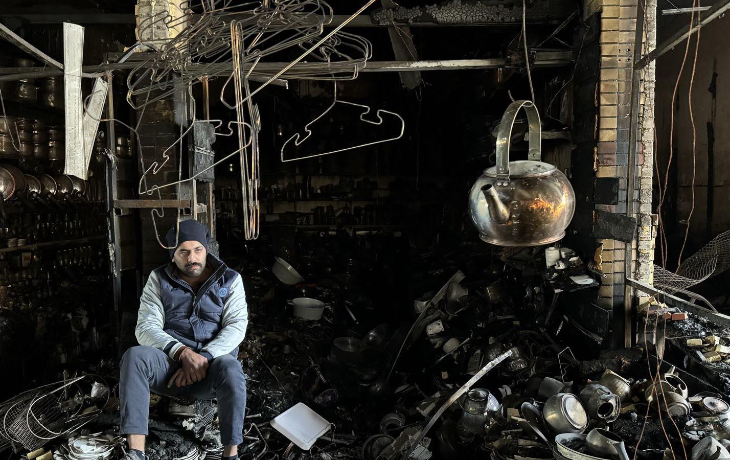 خاوەن دووکانێک لە لەنگەی هەولێر بە خەمبارییەوە لەنێو دووکانە سووتاوەکەیدا دانیشتووە. وێنە: جێگر عومەر - رووداو