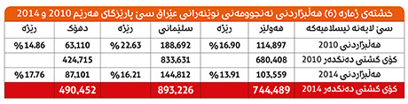 خشتەی ژمارە (6) هەڵبژاردنی ئەنجوومەنی نوێنەرانی عێراق سێ پارێزگای هەرێم 2010 و 2014