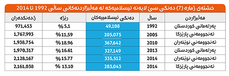 خشتەی ژمارە (7) دەنگی سێ لایەنە ئیسلامیەكە لە هەڵبژاردنەكانی ساڵی 1992 تا 2014