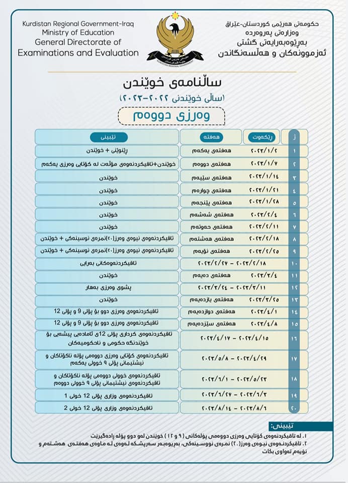 بەگوێرەی ساڵنامەی خوێندن، 13-9-2022 یەکەم رۆژی دەستپێکردنی ساڵی نوێی خوێندن دەبێت لە سەرجەم ناوەندەکانی خوێندنی سەر بە وەزارەتی پەروەردە. هەروەها 29-4-2023 تاوەکو 8-5-2023 بۆ ئەنجامدانی تاقیکردنەوەی کۆتایی وەرزی دووەمی پۆلە ناکۆتاکان و نیشتمانی پۆلی 9ـی خولی دووەم دیاریکراوە.