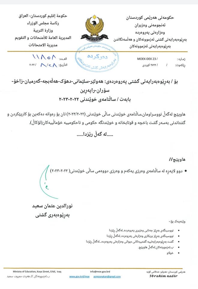 وەزارەتی پەروەردەی هەرێمی کوردستان لە نووسراوێکدا ساڵنامەی خوێندنی ساڵی 2022 - 2023ـی ئاراستەی بەڕێوەبەرایەتییەکانی پەروەردەی هەولێر، سلێمانی، دهۆک، هەڵەبجە، گەرمیان، زاخۆ، سۆران و راپەڕین کردووە و دەڵێت، سەرجەم باخچە و قوتابخانە حکومی و ناحکومییەکان دەگرێتەوە.