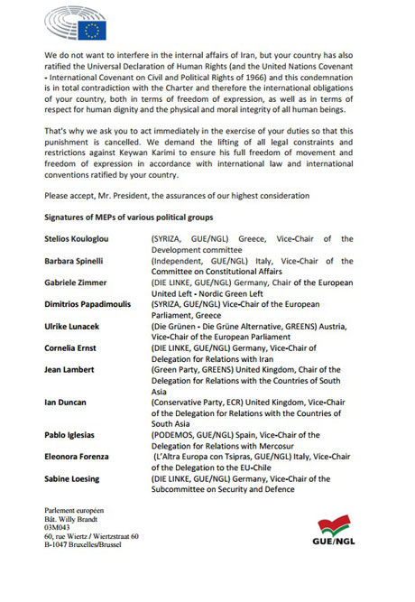 45 پەرلەمانتاری یەکێتی ئەوروپای سەر بە چەند گرووپێکی سیاسی جیاواز، وێڕای پاڵپشتیکردن لە کەیوان کەریمی، نامەیەکیان ئاراستەی حەسەن رۆحانی سەرۆککۆماری ئێران کردووە و، داوای هەڵوەشاندنەوەی حوکمی کەیوان کەریمی-یان لێکردووە.
