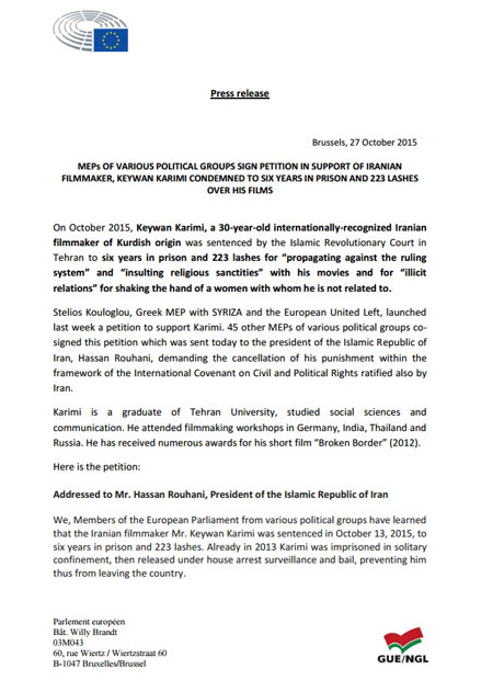 ئێمە ئەندامانی پەرلەمانی ئەوروپا لە چەند گرووپێکی سیاسی جیاوازەوە، زانیومانە کە دەرهێنەر کەیوان کەریمی، لە 13 ی ئەم مانگەدا بڕیاری شەش ساڵ زیندانیكردن و لێدانی 223 قامچی بەسەردا سەپێندراوە.