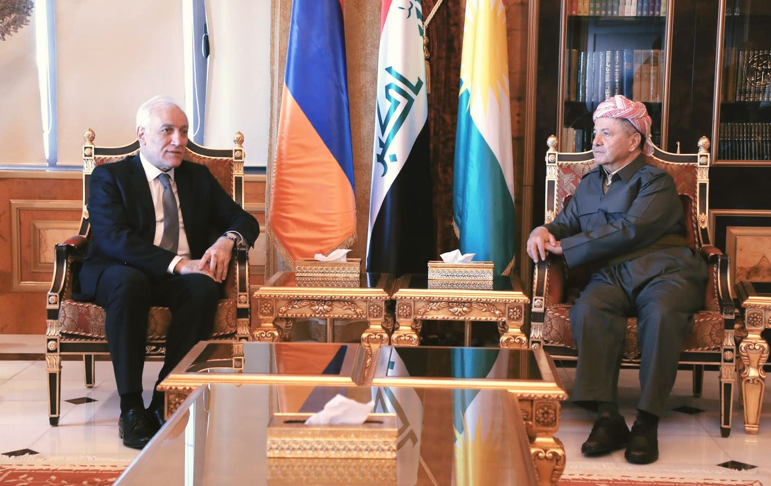 سەرۆک بارزانی "بە گەرمی" بەخێرهاتنی لە سەرۆکی ئەرمینیا کرد و ئاماژەی بە پەیوەندییە مێژووییەكانی نێوان گەلی كوردستان و گەلی ئەرمینیا دا و سوپاسی سەرۆکی ئەو وڵاتەیشی کرد بۆ رێزگرتن لە مافەكانی كوردانی نیشتەجێی ئەرمینیا.