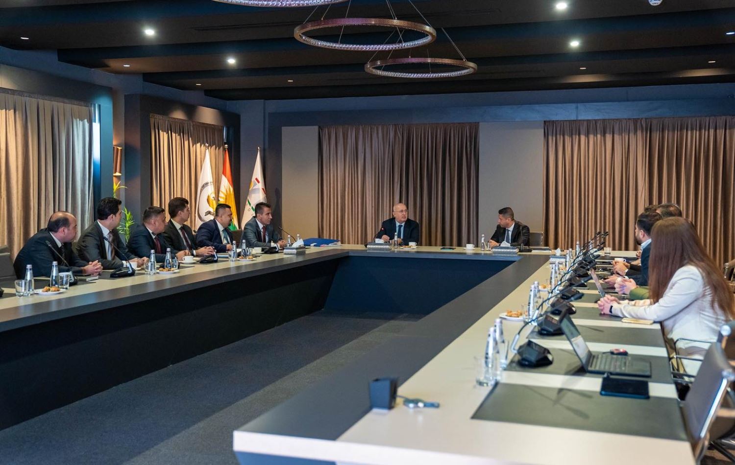 دیمەنێکی کۆبوونەوەکەی ئاوات جەناب نووری، هیوا ئەفەندی و بەڕێوەبەری گشتیی باج و خانووبەرەی میری، وێنە: DIT