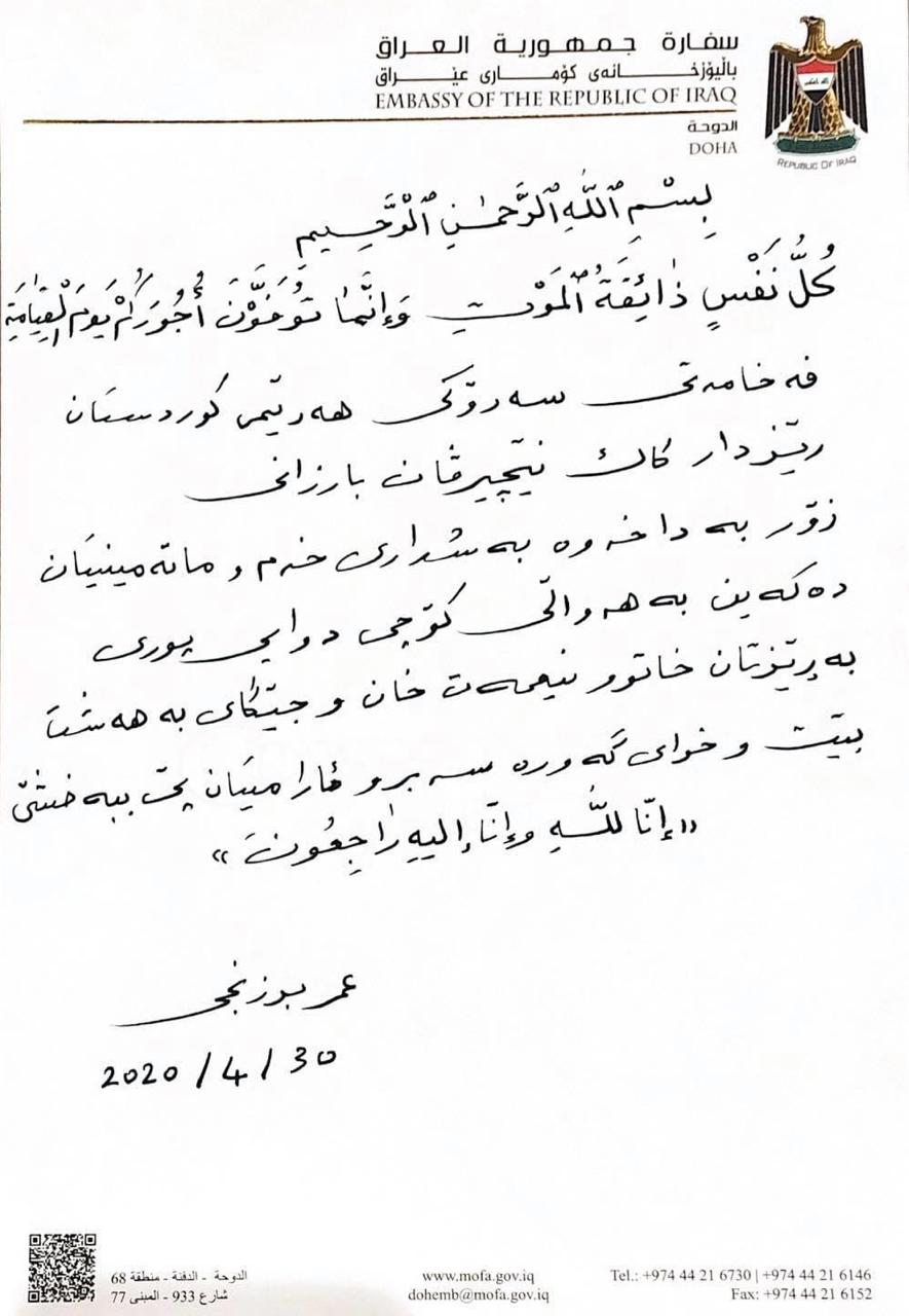 عومەر بەرزنجی باڵیۆزی عێراق لە قەتەر، پرسەنامەیەک ئاراستەی سەرۆکی هەرێمی کوردستان دەکات و تێیدا هاتووە: