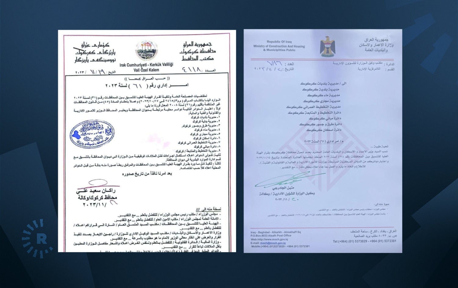 بەگوێرەی نووسراوێک کە وێنەیەکی دەست تۆڕی میدیایی رووداو کەوتووە، رۆژی 20-11-2023، مەتین جادرچی، بریکاری وەزارەتی ئاوەدانکردنەوە و نیشتەجێبوون و شارەوانییەکانی عێراق نووسراوی بۆ ئەو نۆ بەڕێوەبەرایەتییەی کەرکووک کردووە و دەڵێت، "بەنگین رێکانی وەزیری ئاوەدانکردنەوە و نیشتەجێبوون و شارەوانییەکان رایسپاردوون، کەرکووک بڕیاری ژمارە 31ی 2023ی دەستەی باڵای هاوئاهەنگی پارێزگاکان نایگرێتەوە، بەڕێوەبەرایەتییەکانتان ناوەندین و بە وەزارەتەوە گرێدراون بۆ کاروباری (کارگێڕیی، دارایی، یاسایی و تەکنیکی)".