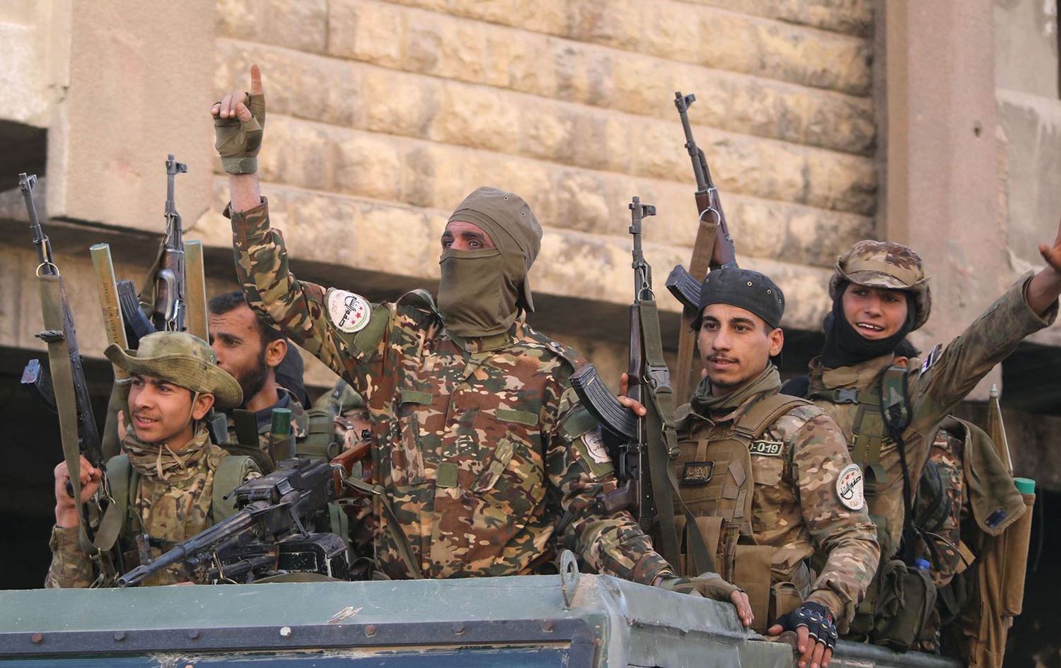 چەکدارانی گرووپی هەڵۆکانی شام کە دژی حکومەتی سووریان لەکاتی ئاهەنگگێڕانیان لە شەقامەکانی ناوچەیەکی ئیدلیب، وێنە: Abdulaziz KETAZ / AFP