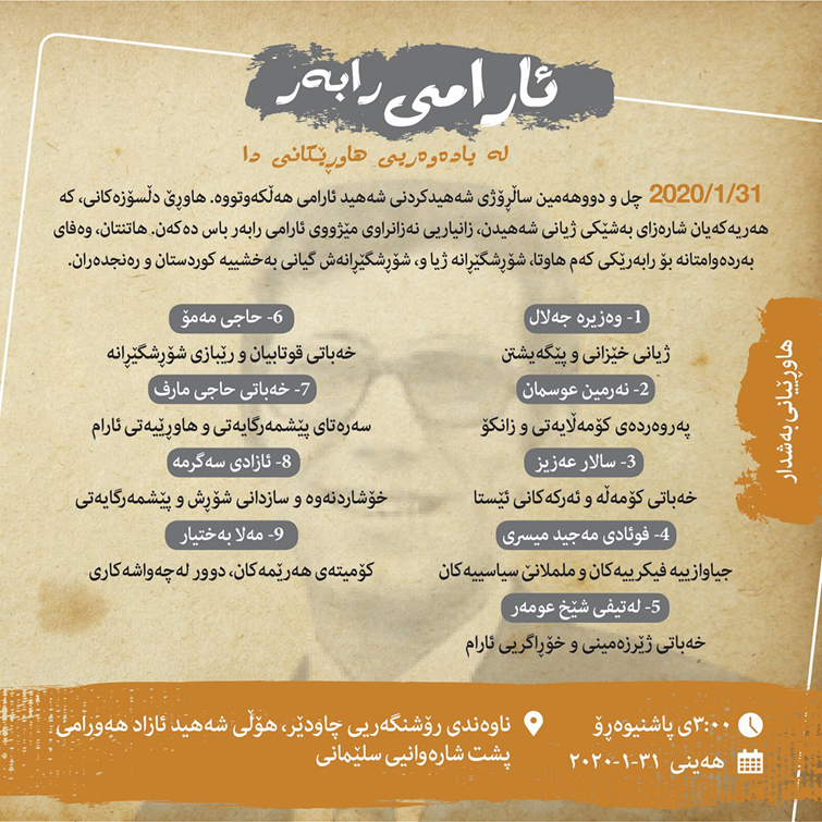 رێوڕەسمەکە لە کاژێر 15:00 لە هۆڵی شەهید ئازاد هەورامی بەڕێوەدەچێت و تێیدا هاوڕێکانی "کە هەرکامەیان شارەزای بەشێکی ژیانی شەهید ئارامن"، زانیاریی نەزانراوی مێژووی ئەو شەهیدە باس دەکەن.