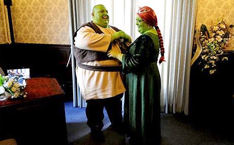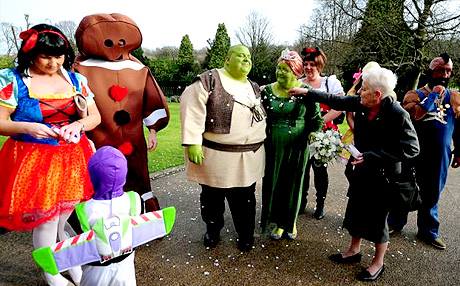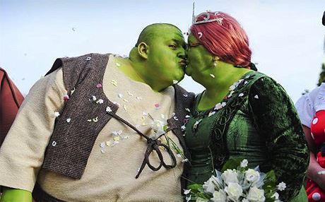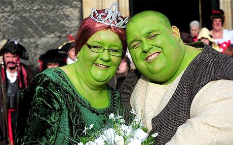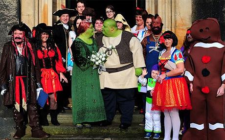 ژن و پیاوێکی بەریتانی بڕیاریان دا لە کاتی ئاهەنگی هاوسەرگیرییان شێوەی خۆیان وەک شڕیک و فیۆنا لێبکەن.