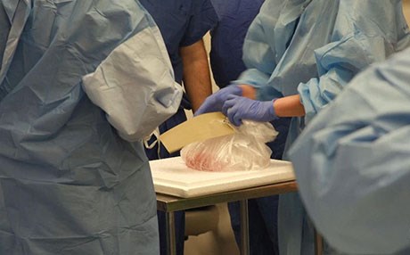 تەواوی چووک و پەردەی گون، بەشێكی سکی نەخۆشەکە لە کەسێكی بەخشەرەوە وەرگیراون.
