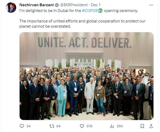 لەو بارەیەوە رۆژی هەینی، سەرۆکایەتیی هەرێمی کوردستان لە راگەیێندراوێکدا گوتی، "نێچيرڤان بارزانى، سهرۆكى ههرێمى كوردستان، له شارى دوبهى له ئيمارات، لهگهڵ ژمارهيهكى بهرچاوى سهرۆك، شا و سهركردهى وڵاتان، بهشدارى له رێوڕهسمى كردنهوهى كارهكانى لووتكهى كۆنفرانسى نهتهوه يهكگرتووهكان بۆ گۆڕانى كهشوههوا (COP28)دا كرد."