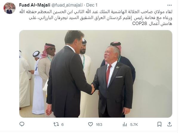 فوئاد مەجالی، کۆنسوڵی گشتیی ئوردن لە هەرێمی کوردستان وێنەی تەوقەی نێچیرڤان بارزانی و شا عەبدوڵڵای دووەمی لە تۆڕی کۆمەڵایەتیی ئێکس بڵاوکردووەتەوە و نووسیویەتی، "دیداری خاوەنشکۆی پایەبەرزی هاشمی، شا عەبدوڵڵای دووەمی کوڕی حوسێن، خوا بیپارێزێت، لەگەڵ فەخامەتی بەڕێز نێچیرڤان بارزانی، سەرۆکی هەرێمی کوردستانی عێراقی برا لە پەراوێزی COP28.