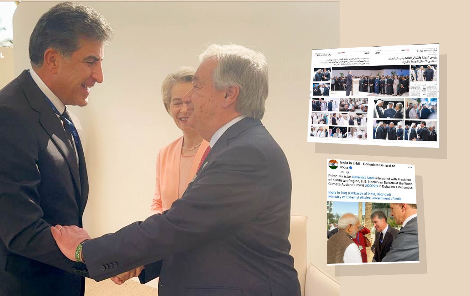 هەروەها کۆنسوڵخانەی گشتیی هیندستان لە هەولێر لە تۆڕی کۆمەڵایەتیی فەیسبووک وێنەی سەرۆکی هەرێمی کوردستان و نارێندرا مۆدیی داناوە و نووسیویەتی، "سەرۆکوەزیران نارێندرا مۆدی، لە 1ی کانوونی دووەم، لە لووتکەی کەشوهەوای جیهانی (کۆپ 28) لە دوبەی، قسەی لەگەڵ بەرێز نێچیرڤان بارزانی، سەرۆکی هەرێمی کوردستان کرد."